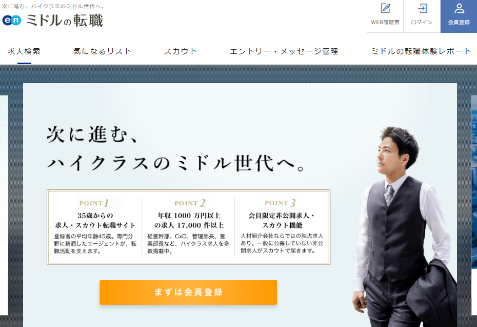 | ミドルの転職 | エン・ジャパン株式会社 | スカウト型転職サービス | 30代後半〜40代 | 非公開求人含む | スカウト受信、エージェント連携、求人検索 |